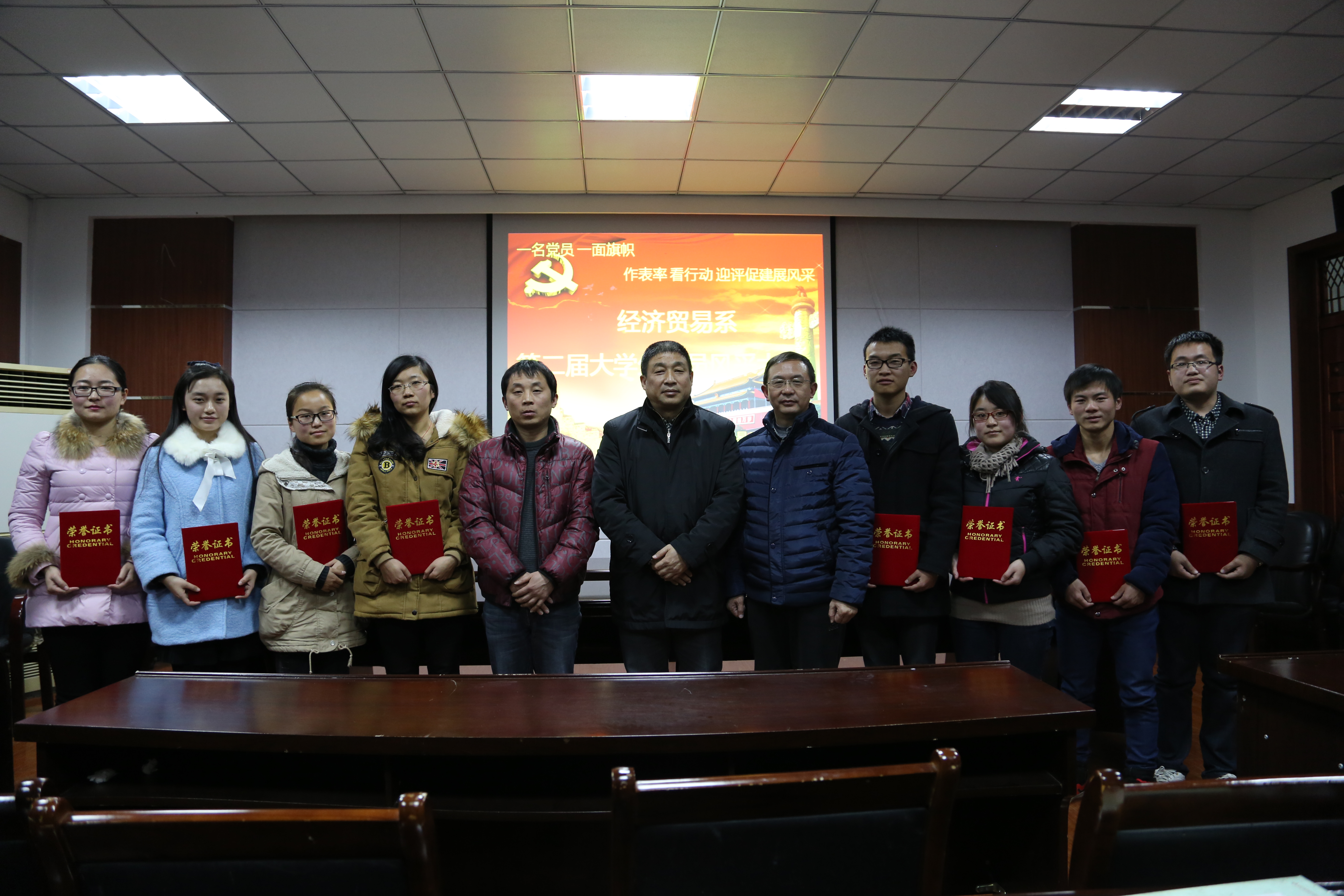 2014年12月24日晚,经贸系在系会议室举办了以“一名党员、一面旗帜”为主题的大学生党员风采大赛。系党总支书记罗志刚、副主任杨荣明、实习实训中心主任吴自爱以及学生党支部书记苏飞等参加了此次活动,此外系学生党员、第49期入党积极分子代表也观看了这次比赛。