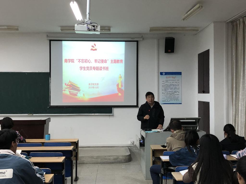 10月18日晚,伟德国际1946bv官网在博识南403教室举行“不忘初心、牢记使命”主题教育学生党员专题读书班开班仪式,学院党委书记罗志刚、院长项桂娥、党政办主任苏飞、各学生党支部书记、全体学生党员参加,仪式由组织员陈周庆主持。