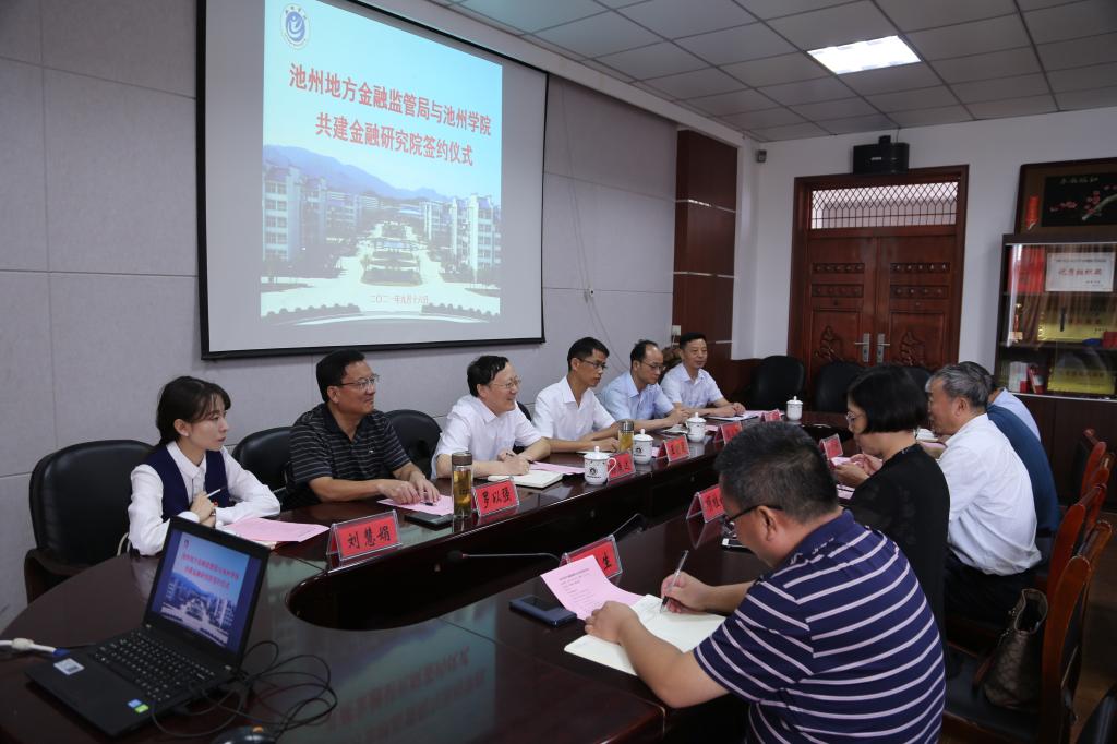2021年9月16日,池州学院与地方金融监管局共建金融研究院签约仪式在伟德国际1946bv官网博识楼会议室举行。参加签约仪式的有池州市地方金融监管局局长孙康达,副局长罗以强,池州市委组织部人才办主任王明星,池州市建设银行行长高小飞,池州市交通银行行长刘慧娟,池州市九华农商行副行长吴旭初,以及池州学院纪委书记汪海,伟德国际1946bv官网党委书记罗志刚,院长项桂娥,党委副书记肖宁生,副院长吴自爱。签约仪式由伟德国际1946bv官网副院长吴自爱主持。