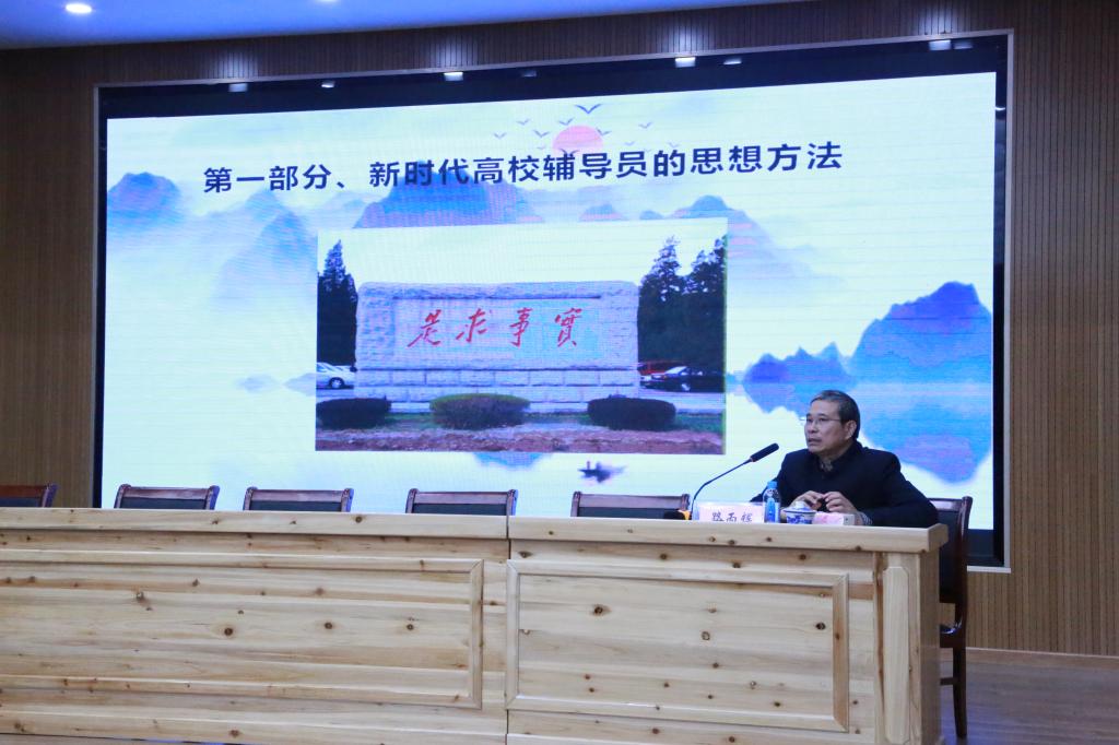 随后,路丙辉教授以《新时代高校管理人员的思想方法与工作方法》为题作了学术报告。他指出,新时代管理人员的思想方法是坚持实事求是,工作方法是坚持群众路线。接着他联系自身思想政治教育工作经历,以辅导员班级管理中的兴趣小组建设为例,以生动幽默的语言、深入浅出阐述了这一思想方法和工作方法在高校管理工作的运用。同时,路教授在报告中还提出,解决当前思想政治教育困境的路径,需要高校管理人员“思维要新,视野要广”,以家庭为抓手,突破“三全育人”范畴的局限,达到家校合一,实现全员全程全方位育人。听完路讲授的讲座,参会人员都表示受益匪浅。